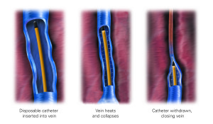The ClosureFast™ catheter is inserted into the vein through a tiny incision below the knee. Guidedby ultrasound imaging, the physician treats a 7 cm segment of vein with a 20-second burst of radiofrequency energy, causing the vessel to shrink around the catheter. The physician withdraws the catheter, treating each segment until the entire length of the vein has been sealed. An average 45 cm length vein can be treated in this manner in just three to five minutes. Light sedation is given prior to procedure for comfort.